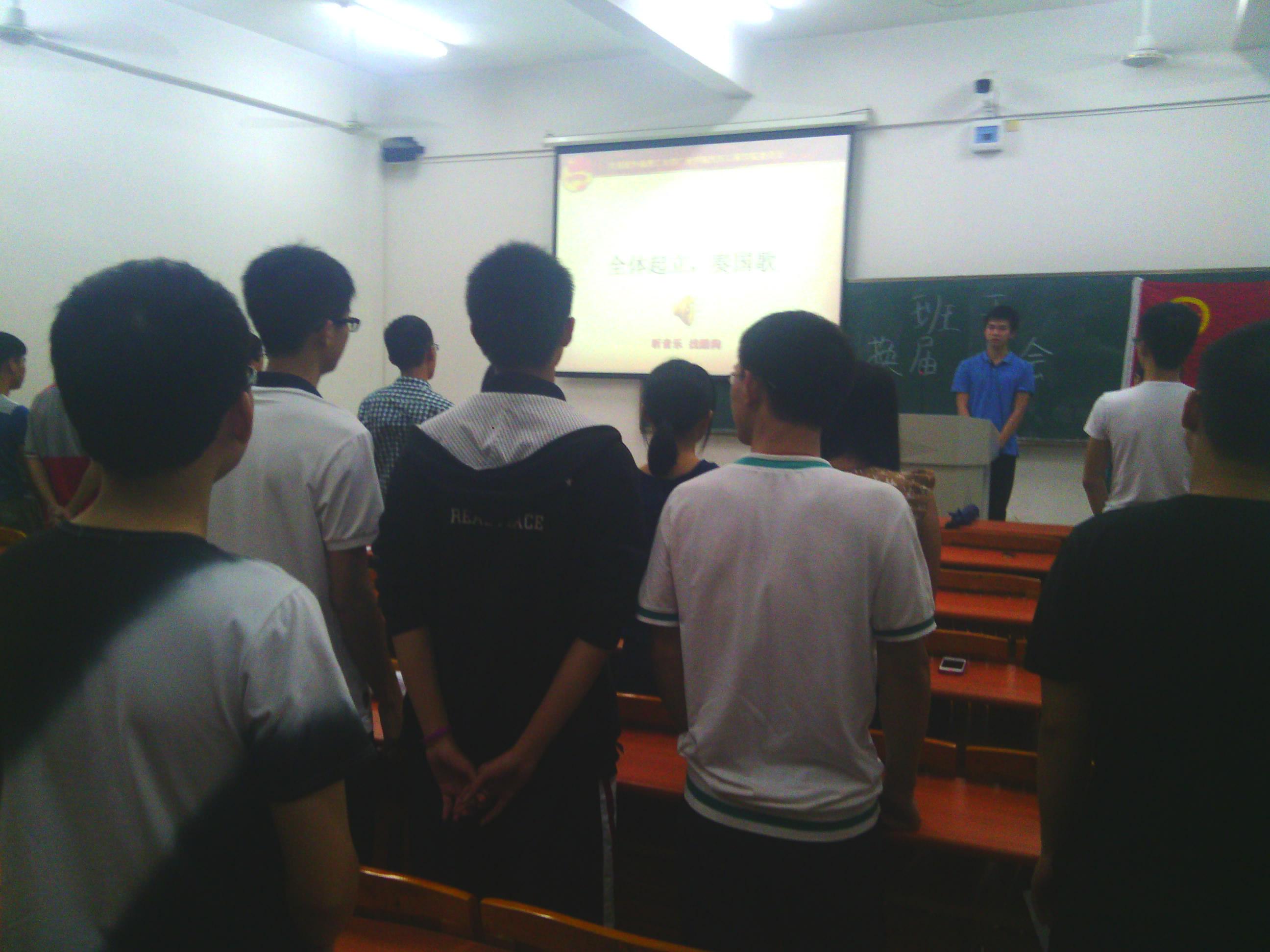会议第一项奏国歌,国歌的旋律唤醒着团支部每一位成员心中的那份责任感与使命感.