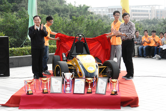 本网讯 在刚落幕的2013年中国大学生方程式汽车大赛中,我校FSAE-华汽车队在今年的全国大赛中不负众望,一举夺得“最佳新秀车队奖”、易车杯FSC“新闻传播大奖”、易车杯“网络传播奖”、“营销报告(燃油组)第二名”、“2013中国大学生车手挑战赛亚军”五项大奖。为了让更多的人对我校FSAE-华汽车队有更深一步的认识与了解,让更多的同学对大学生方程式汽车大赛有更深刻的了解并参与其中,11月21日下午,FSAE-华汽车队新车发布会在我校学生活动中心广场举行。学校党委书记袁文俊,汽车工程学院院长陈秉均、副院长尚启超、陈晓明,北华大学汽车工程学院院长刘瑞军,费思拓公司企业代表于泳聪,法斯特公司企业代表黄云,广东体育频道媒体代表黄利强及100余名师生出席发布会。