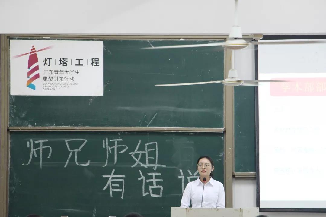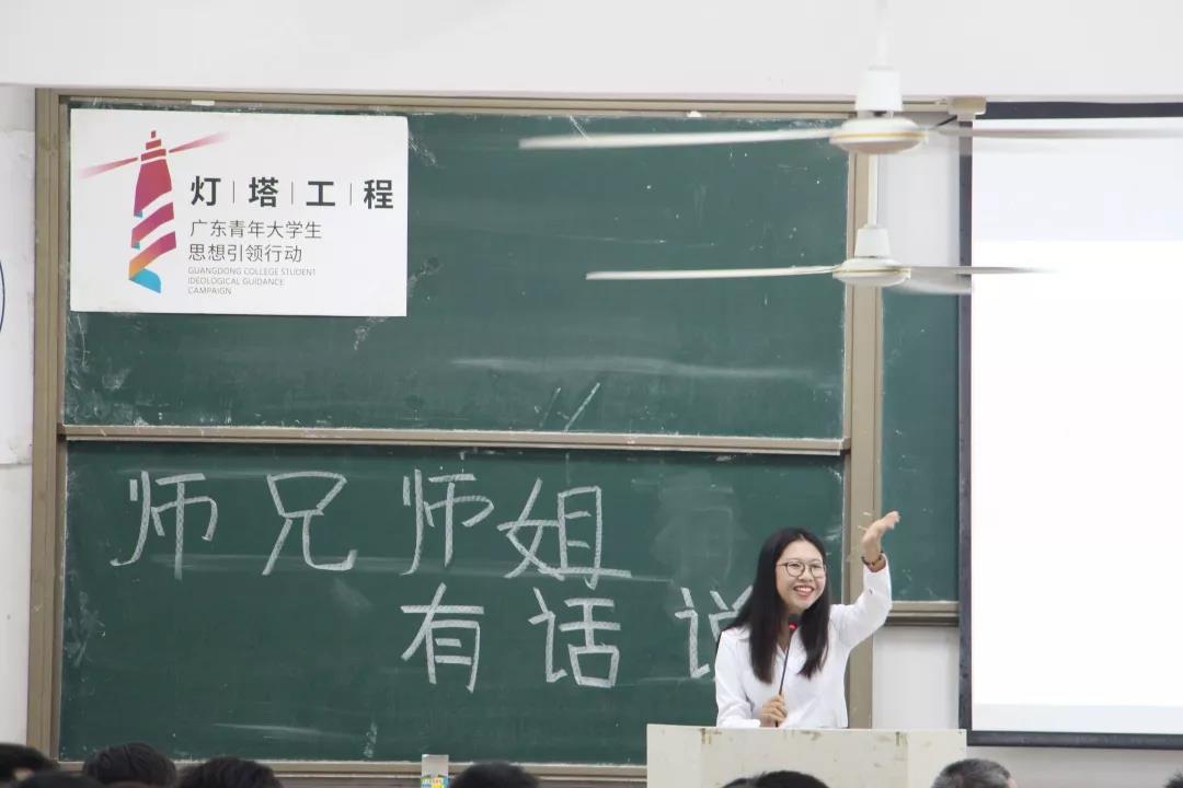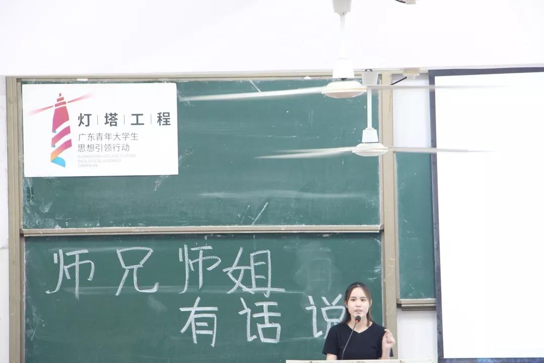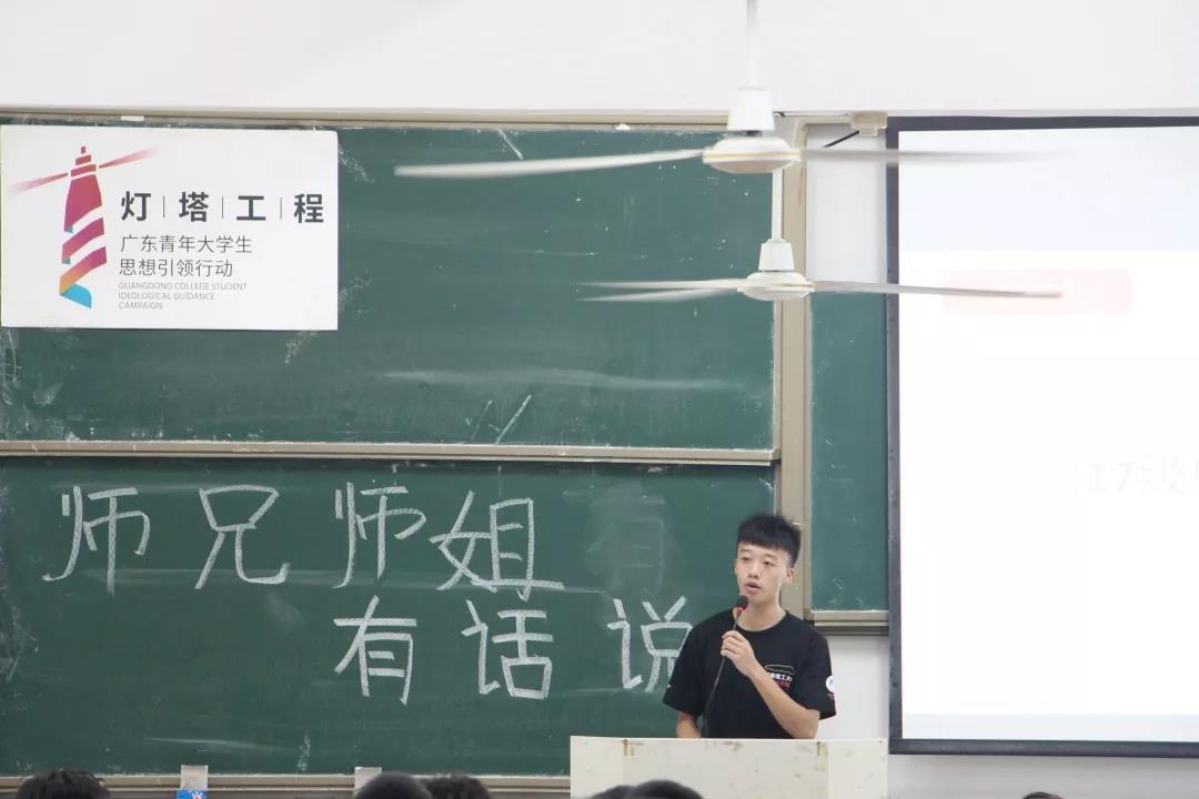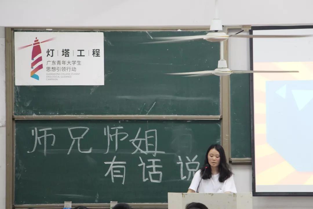 首先,是由16级杨祺彬师姐发言。师姐告诉师弟师妹们要尽快的适应大学生活,做到有规律的生活,合理安排好自己的时间。无论做什么事情都要做到不放弃,坚持下去。
