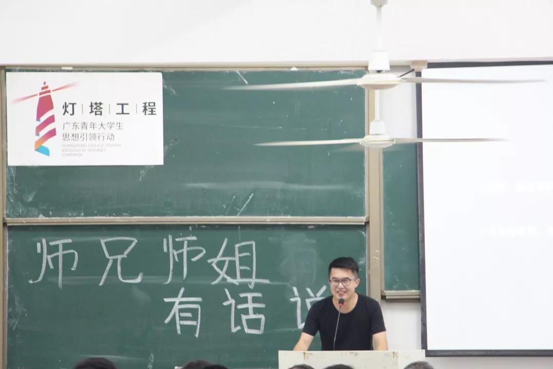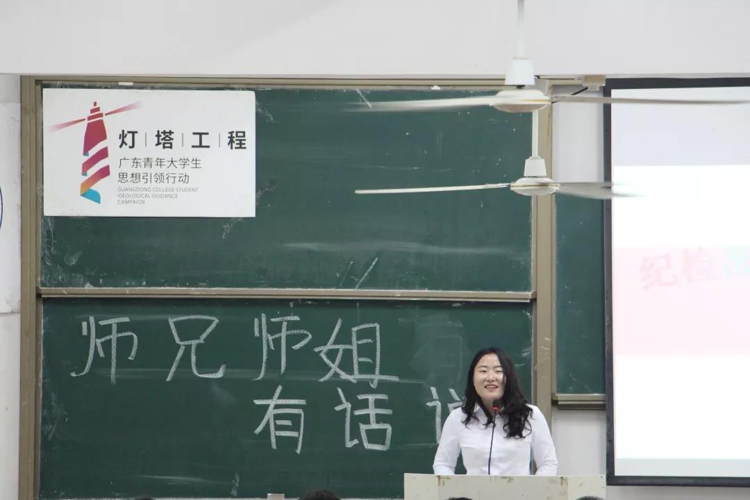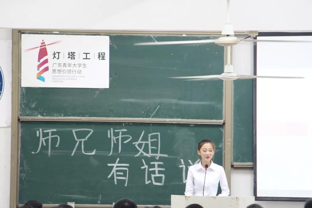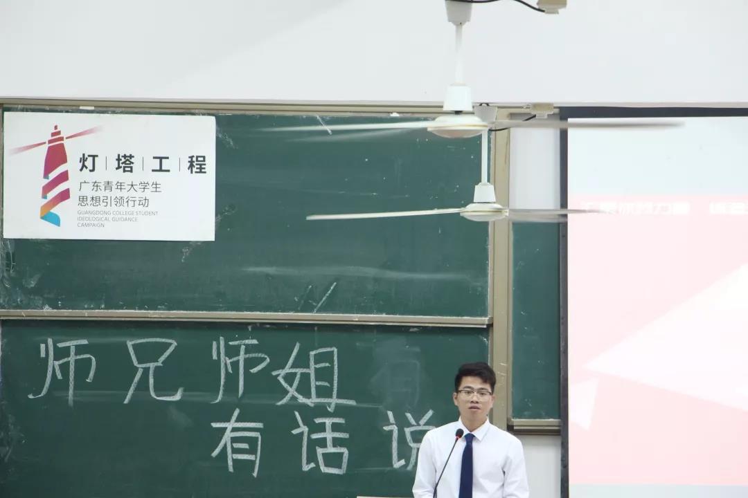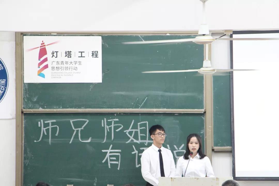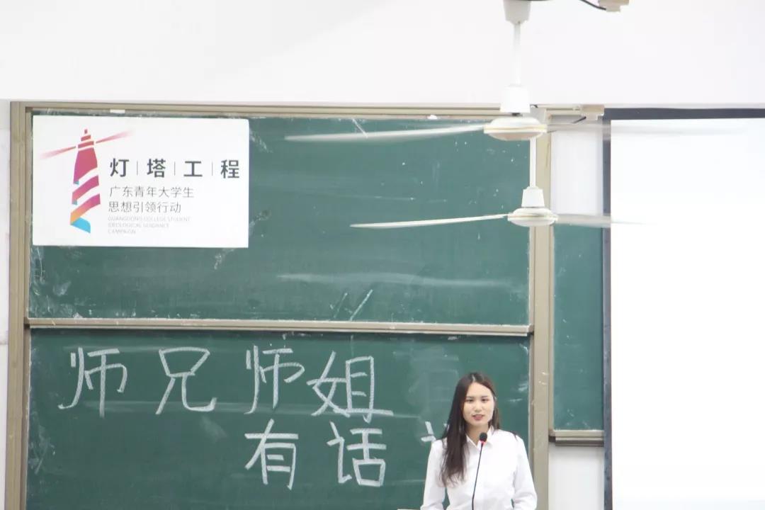 首先,是由16级杨祺彬师姐发言。师姐告诉师弟师妹们要尽快的适应大学生活,做到有规律的生活,合理安排好自己的时间。无论做什么事情都要做到不放弃,坚持下去。