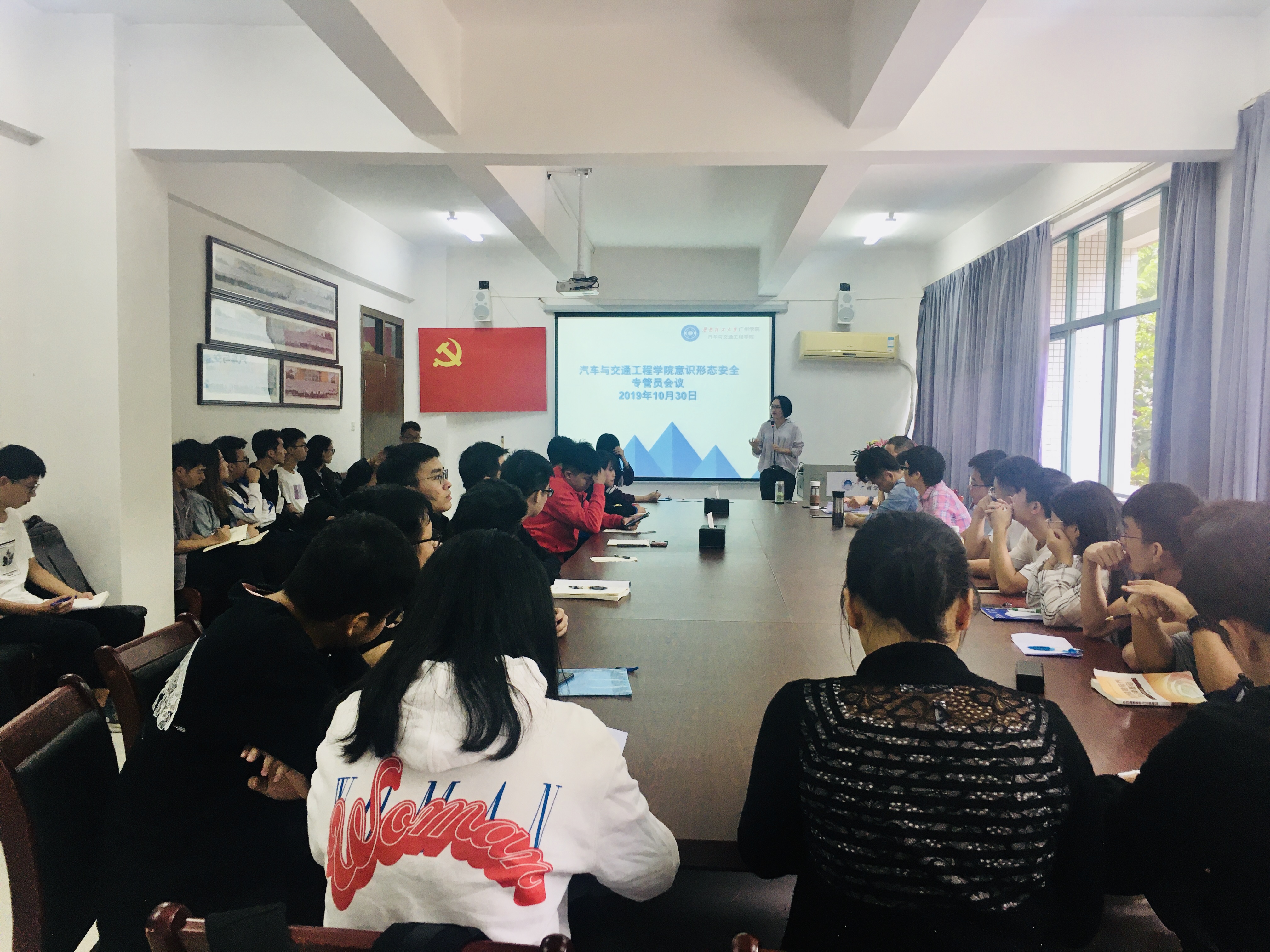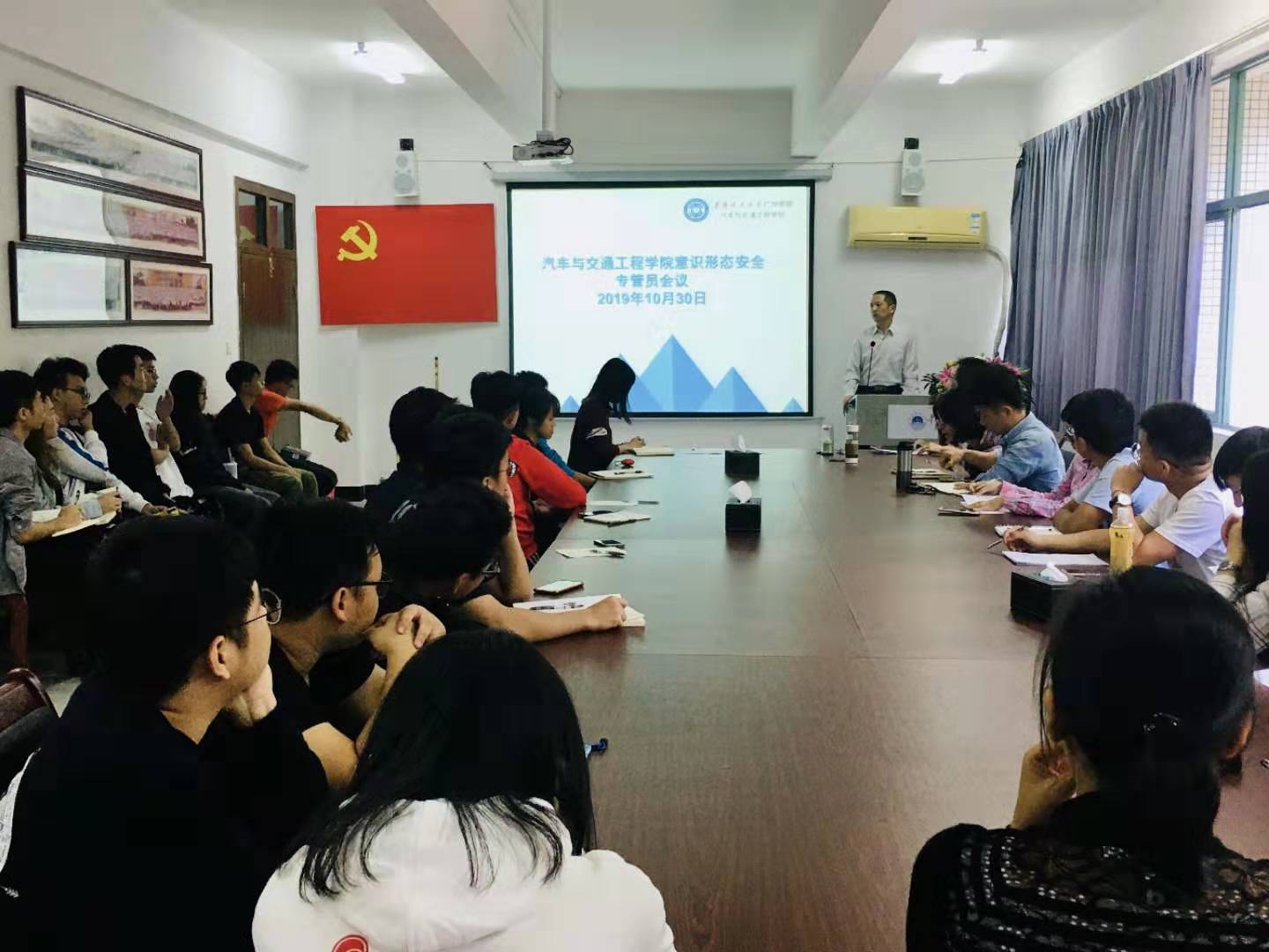 【本网讯记者 钟惠军 纪书燕】为了进一步深入开展“不忘初心、牢记使命”主题教育,增加意识形态领域工作的针对性和有效性,巩固马克思主义的指导地位,10月30日中午12:50,汽车与交通工程学院在B6-203会议室召开了意识形态安全专管员大会,该学院党总支书记尚启超,各党支部书记,各科室、各团支部、各创新团队的意识形态安全专管员共计40余人参加了会议。