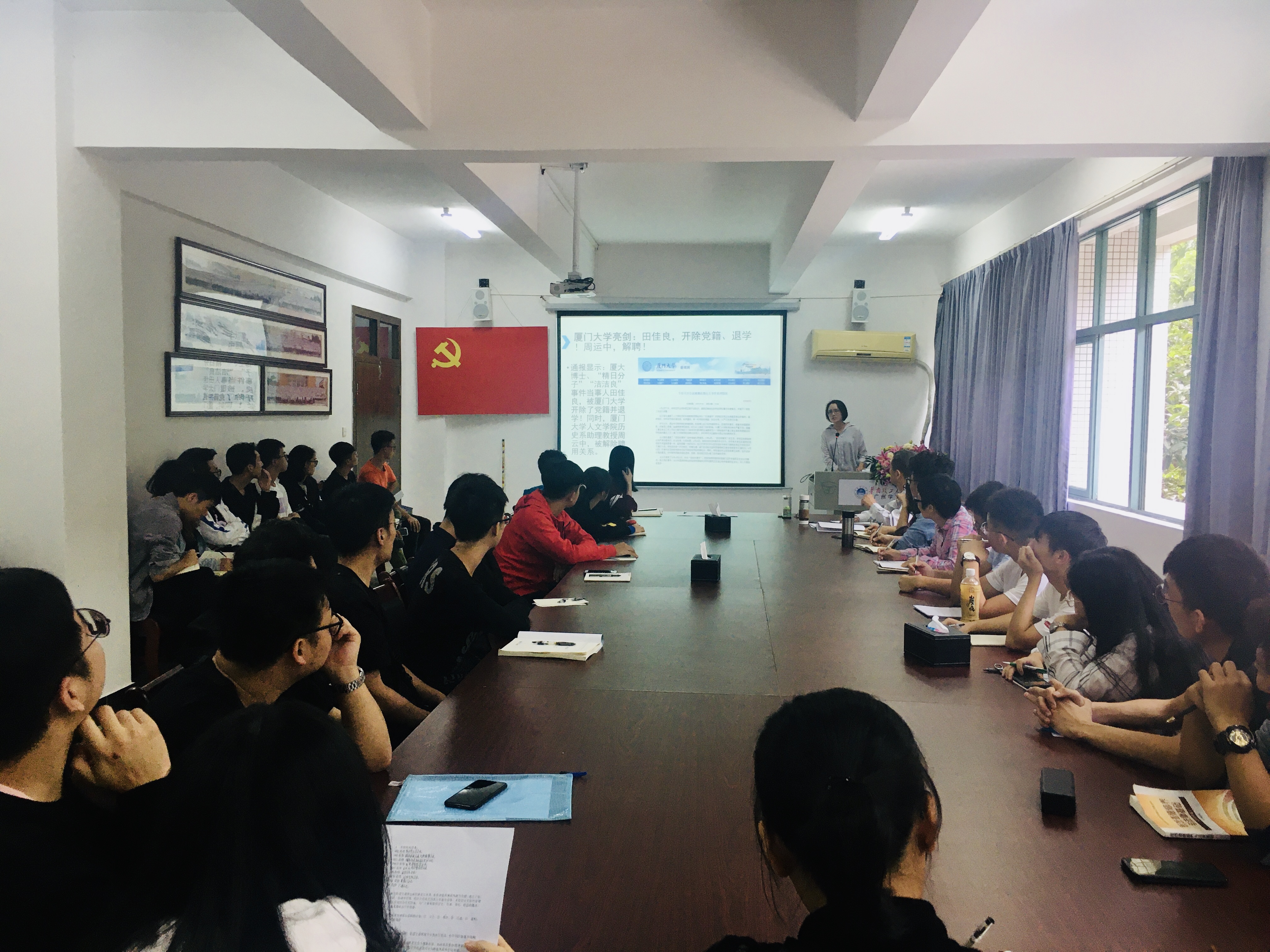 会上,汽车与交通工程学院党总支副书记纪书燕从“洁洁良事件”,原湖南城市学院2018级新生王栋“不爱国言论”以及70周年国庆假期间个别网民的不良言论等现象出发,向在场师生表明我国意识形态正面临着巨大风险,加强意识形态安全的工作已经到了不容忽视的地步,提醒在场的学生骨干和各科室骨干要充分地认识高校意识形态工作极端重要性。