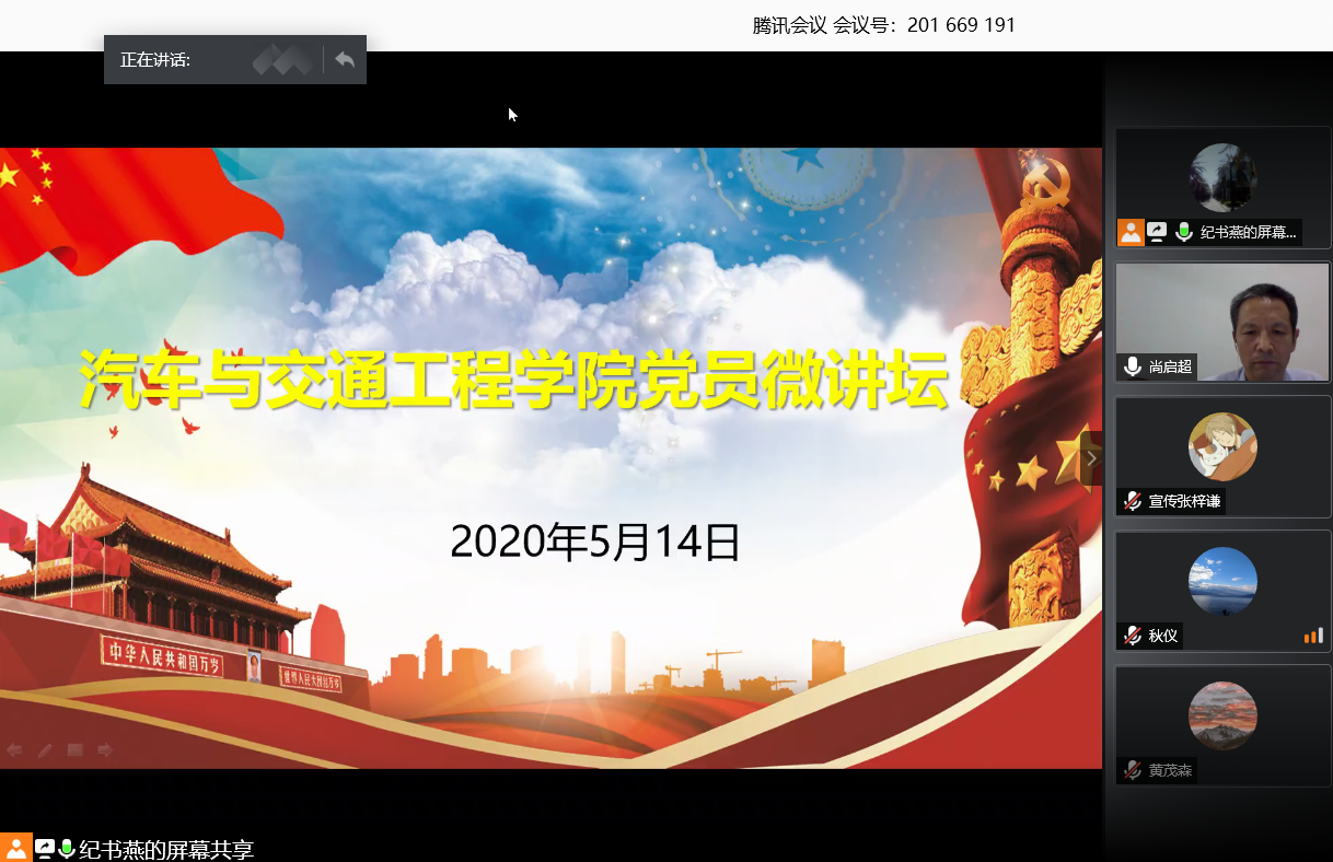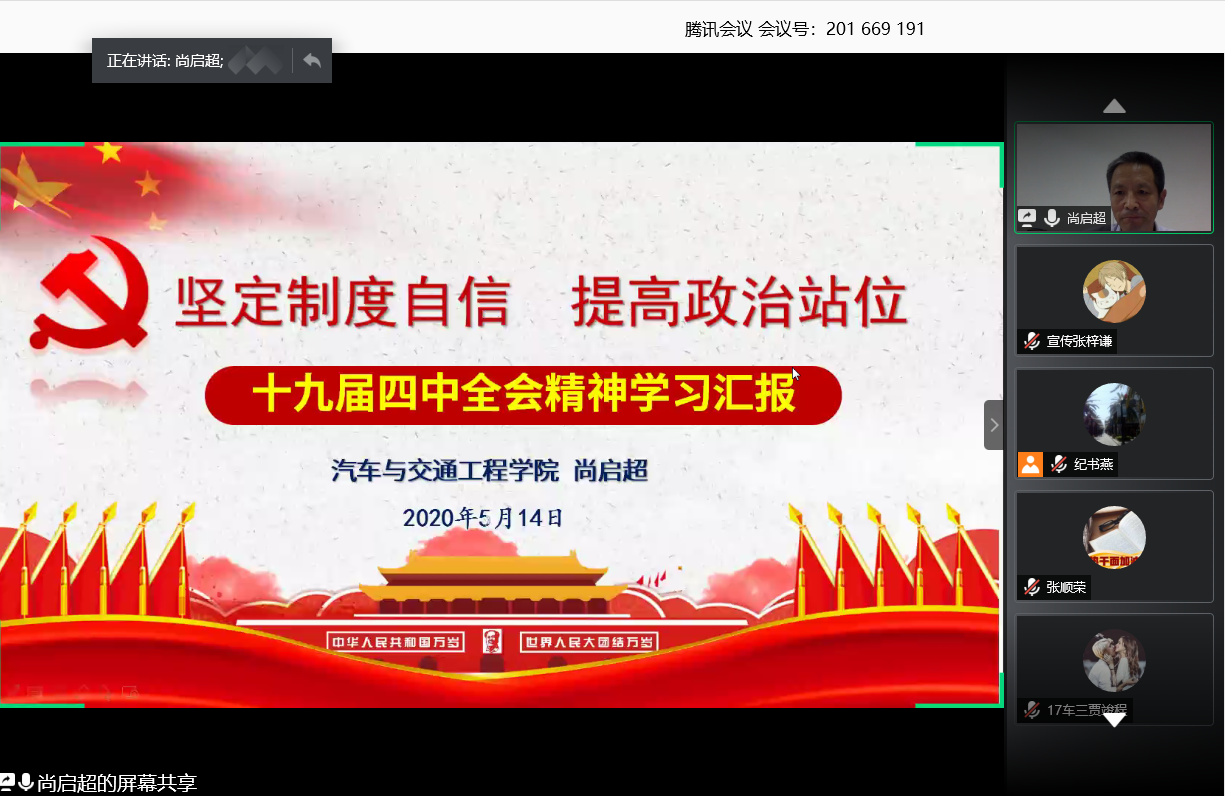 (本网讯 记者 纪书燕)为深入推进“两学一做”学习教育的常态化制度化,建立不忘初心、牢记使命制度,不断提升广大党员理论素养、党性修养、业务能力,汽车与交通工程学院党总支学期初制定了开展“党员微讲坛”项目计划。经过一个多月的筹备,5月14日下午14:30,我院党总支书记尚启超以“坚定制度自信、提高政治站位-十九届四中全会精神学习汇报”为题开展第一讲,我院全体教职工、学生(预备)党员、入党积极分子近120人参加了会议。