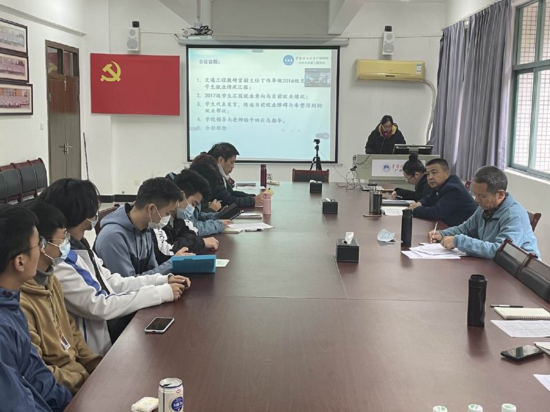【本网讯记者 汤斯敏】2020年12月16日,我院的交通工程教研室在B6-203召开了2017级交通工程专业学生就业意向摸查与就业动员会。本次会议采取线上线下同步进行的方式召开。我院副院长姜立标,副院长尚启超,院长助理钟玉华,党总支副书记纪书燕,教研室主任胡习之、副主任丁伟华、教研室全体教师、2017级班主任孙园及2017级交通工程全体同学出席了本次会议。