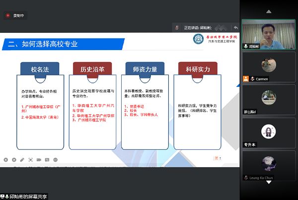 对于“如何选择高校专业”,邱灿彬以广州城市理工学院为例,介绍了选择高校的八大方法:校名法、历史沿革、师资力量、科研实力、专业特色、硬件设备、社会及学生评价和招生分数。他还详细介绍了我校汽车与交通工程学院的FSAE-华汽车队、FSAE-电动赛车队、飞鱼物流创新创业工作室、华广攀创空间和华广智能车队等五大学生竞赛团队作。