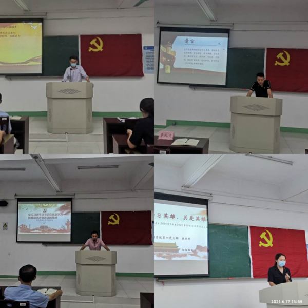 四位同志分别从不同方面分享了学习“习近平总书记在党史学习教育动员大会上的重要讲话精神和关于党的历史的重要论述精神”。张继锋分享了会议精神的三大板块,第一,开展党史学习教育意义重大(三个必然要求),第二,开展党史学习要突出重点(六个重点),第三,在全党开展当时学习教育要务求实效(四个内容)。重点谈了自己的心得体会,需要牢记初心、坚定信仰、永葆活力。程清伟分享了四个方面,一、明真理:学史明理,坚信创新理念,感悟真理力量;二、增信念:学史增信就是要增强信仰信念信心;三、崇德行:学史崇德,立德固本,修德正身,守得致远;四、见行动:学史力行,坚持行胜于言,行动要见成效。邱灿彬分享的主题是“党员身份永远不能忘记“,分为两部分。第一部分分享了教育动员大会的讲话精神,其中包括思想和行动统一、发扬革命精神、总结经验,勇于挑战、增强党的团结和集中统一,第二部分他分享了自己的学习感悟,其中包括为何学、学什么、怎么学、办实事。段昆昕从回顾习近平同志讲话文稿,崇尚、学习、关爱英雄-我们在路上,个人认识与感想三个方面进行了分享。她讲到榜样的力量是无穷的,精神的力量是伟大的。我们学习“凡人”英雄,礼赞“凡人”英雄,就是要拿出实实在在的行动学习、践行英雄精神,把英雄的精神转化为坚定的信仰信念,转化为越是艰险越向前的强劲力量,用过硬担当、过硬本领,务实行动、无私奉献,凝聚起夺取战疫斗贫双场胜利的强大合力,交出不负时代、不负人民的优异答卷。