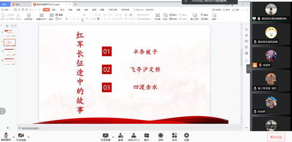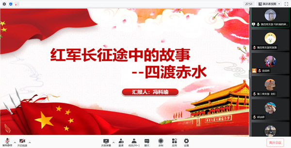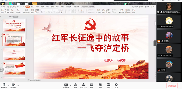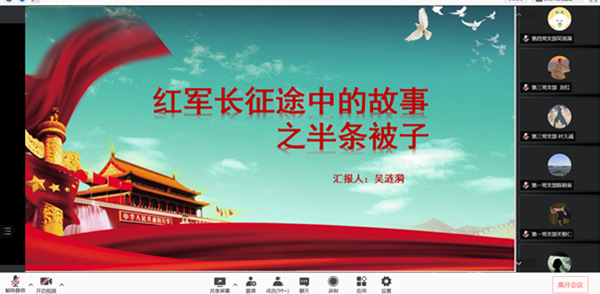 本网讯(记者 吴涟漪)汽车与交通工程学院党总支于2021年9月23日中午12:50在腾讯会议召开了党员微讲坛第二十六讲,我院党总支副书记纪书燕及全体学生党员和入党积极分子参与了本次会议。本次微讲坛由吴涟漪、冯锐彬和冯科瑜同志主讲,内容以红军长征途中的故事为主题进行分享学习。