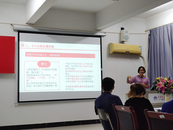 纪书燕同志讲述了党的十六大召开背景,党的十六大基本内容,党的十六大的历史贡献。党的十六大是在新世纪召开的第一次代表大会,它为21世纪如何加强党的建设指明了方向。
