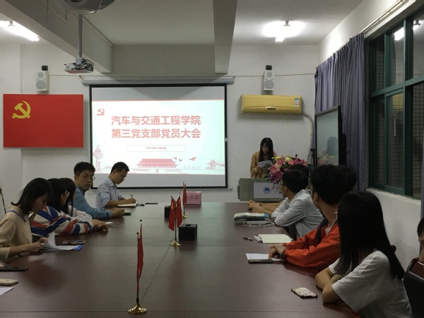 本网讯(记者 叶久诚、谭信豪)2021年11月4日晚19:30,汽车与交通工程学院第三党支部于B6-203顺利召开了第三党支部党员大会。所有的第三党支部教工党员、学生党员、学生预备党员、党员发展对象都参加了本次大会参加,大会由邱冰妍同志主持。