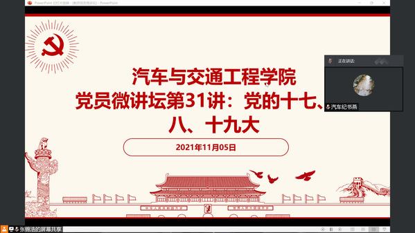 本网讯(记者 李良媛)汽车与交通工程学院党总支于11月5日晚上19:30在腾讯会议开展了党员微讲坛第三十一讲,学习了党的十七、党的十八、党的十九大精神,本次微讲坛由党总支副书记纪书燕同志主持,由李淼林、张锦浩、汤斯敏三位同志主讲,会议历时70分钟左右,主要内容分别为党的十七、党的十八、党的十九大精神为主题进行分享学习,我院教工党员和教工入党积极分子参加了本次会议。