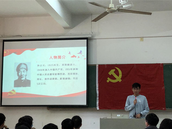 王子铭同志讲述了英雄人物孙占元,他分别从人物简介、人物事迹、人物精神进行了讲解,一级战斗英雄孙占元是上甘岭战役的烈士,牺牲时年仅27岁,被授予了多项国家荣誉,他的不畏艰难、不怕牺牲,不完成党的任务,绝不离开自己的岗位的精神激励着我们一代又一代人。