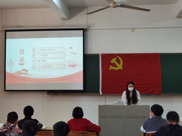 会上,学生党务中心段昆昕介绍了十九届六中全会的会议议程、会议精神,重点讲述“三个需要”、“两个确定”以及“五个历史意义”,新时代青年学子要提高政治站位,进一步增强“四个意识”、坚定“四个自信”、做到“两个维护”,坚决捍卫“两个确立”,坚持党的全面领导,坚持以习近平新时代中国特色社会主义思想指导实践,为实现中华民族伟大复兴的中国梦而不懈奋斗,确保全党步调一致向前进的需要。学生党务中心康明围绕“十个坚持”、“一个根本问题”、四个“必须”、“一个号召”、“一个十分重要的代表大会”等方面重要内容,指出党的十九届六中全会是在我们党百年华诞的重要时刻,在“两个一百年”奋斗目标历史交汇关键节点上召开的一次重要会议,作为新时代的青年和入党积极分子,我们一定要牢记中国共产党是什么,要干什么这个根本问题,时刻牢记共产党员的政治身份和初心使命。