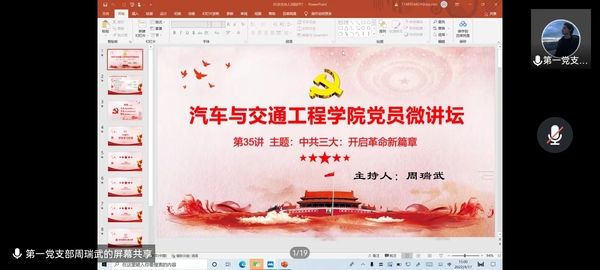 本网讯(记者 何立安)为深入学习贯彻习近平总书记关于党的历史的重要论述,推党史学习教育不断走深走实,了解革命先辈们的奋斗历程,感悟先辈们不屈不挠的奋斗精神。汽车与交通工程学院党总支于4月17日在腾讯会议召开了党员微讲坛第三十五讲,内容以“中共三大:开启革命新篇章”为主题。学院党总支书记林叙群、副书记纪书燕以及全体学生(预备)党员和入党积极分子参加了本次会议。