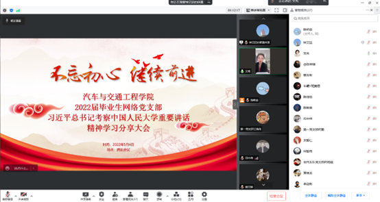 本网讯(记者 陈明翁)为密切毕业生党员、积极分子和支部的联系,加强党的理论学习,汽车与交通工程学院2022届毕业生网络党支部于5月4日在腾讯会议上开展了一次关于习近平总书记考察中国人民大学重要讲话精神的分享会。支部书记文秀、学生党员、入党积极分子共计36人参加会议。