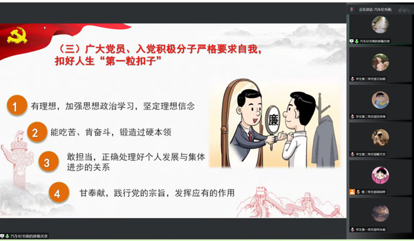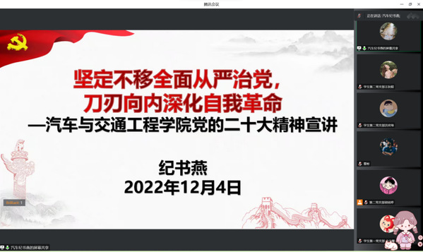 本网讯(记者 肖子杰)为深入学习贯彻党的二十大精神,引导学生党员和入党积极分子更全面地把握二十大精神,不断提升学习深度。汽车与交通工程学院于2022年12月4日晚上19:00在腾讯会议召开了主题为“坚定不移全面从严治党,刀刃向深化自我革命”的理论会议。出席本次会议的有学院党总支书记林叙群、副书记纪书燕以及全体学生(预备)党员和积极分子,活动由纪书燕主持。