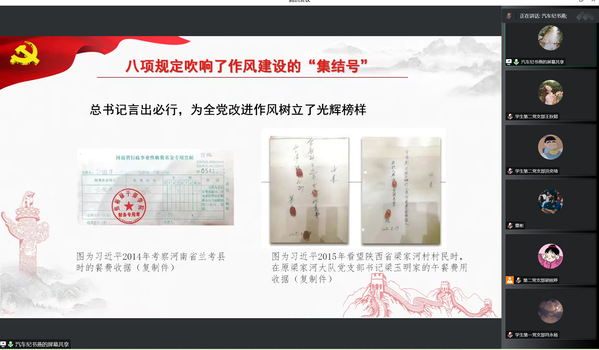 纪书燕以党的二十大报告从严治党板块为中心,解读了党的十八大以来党中央不断推进党的自我革命、全面推进从严治党等重大工作部署的现实意义和深远历史意义,强调牢记全面从严治党永远在路上,党的自我革命永远在路上。通过多层次、多角度的细致讲解,突出了党在从严治党以来深入反腐斗争的光辉成果,通过介绍从严治党所取得的一系列重大成就,结合习近平总书记在河北正定工作和2014年考察河南省兰考县时发生的故事,体现了以习近平同志为核心的党中央以身作则、以上率下,发扬钉钉子精神,严格执行中央八项规定,持之以恒纠治“四风”,刹住了一些过去被认为不可能刹住的歪风,纠治了一些多年未除的顽瘴痼疾。中央八项规定已经深入人心,成为党的作风建设的代名词、全面从严治党的金色名片。