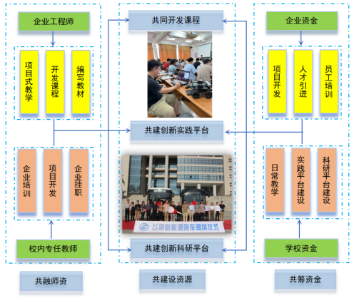 按照“产教融合、专业对接、课程衔接”的思路,加强与企业协同力度,大力开展智能车辆与新能源汽车产业学院建设依托产业学院创新人才培养方案、培养规格、课程体系、教学内容、教学方式、考核评价等;在新工科建设目标指引下,通过校企共同开发课程、导入企业实践项目、采用双导师制等方式,学院组织专家详细论证,构建了全新的课程体系,共同制定了适应产业学院的人才培养方案,重点培养学生多学科知识交叉及解决复杂工程问题的能力。