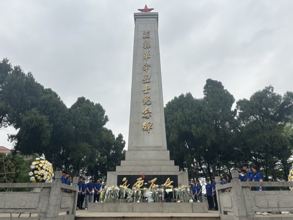 活动伊始,全体成员在烈士陵园入口处整齐列队,拍摄合照。四月的陵园松柏苍翠,纪念碑巍峨矗立。全体成员身着统一院服,在纪念碑前整齐列队,神情庄重。阴云低垂的天幕与庄严肃穆的陵园建筑相互映衬,仿佛历史长河中的烽火岁月正与当代青年的赤子之心展开时空对话。
