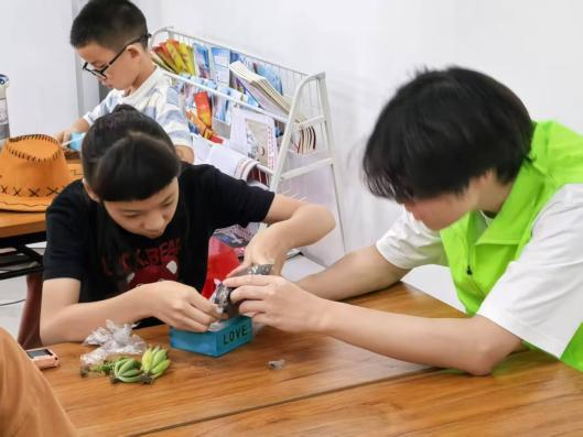 在完成竹编画制作后,多肉DIY课程随即展开。实践团成员搬来装满营养土的木箱,形态各异的多肉瞬间吸引了小朋友们的目光,他们纷纷兴奋地指着多肉说道:“这个像小熊的爪子!”“那个长得像莲花!”在实践团成员肖书庭的指导下,小朋友们依次用小铲子在花盆里铺好陶粒,再舀入营养土并轻轻按出小坑。然后将多肉植入。
