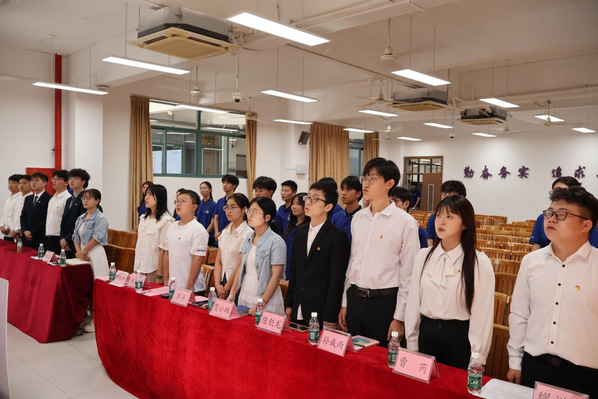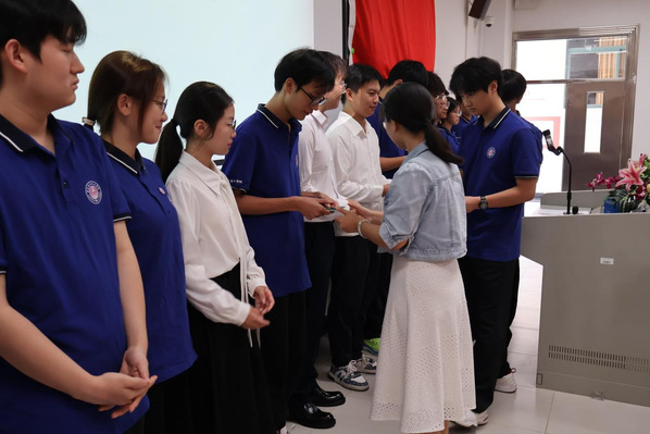 仪式上,黄丽萍为新团员逐一颁发团徽和团员证。团徽是共青团员身份的象征,团员证记录着青春的誓言。在王锶埼同学的领誓下,全体新团员面向团旗,举起右拳庄严宣誓,将“牢记团员身份、不忘初心、砥砺前行”的信念深植于心。