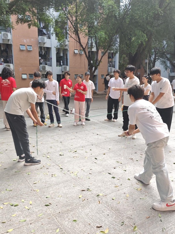 活动伊始,各小组依次进行风采展示,汇报队名、口号,并配合统一手势进行创意演绎,现场气氛热烈。随后,全体成员分组前往校园各处游戏点,开启丰富多彩的素拓项目。