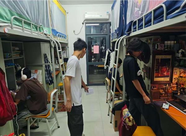 随后,各小组深入宿舍,一方面重点排查违规电器使用、私拉乱接电线、消防通道堵塞等安全隐患,向同学们讲解宿舍安全知识与用电规范,提醒大家要杜绝晚归、夜不归宿等行为;另一方面,对照文明宿舍评比标准,从内务整洁、物品摆放、纪律规范等方面进行客观评分,挖掘优秀宿舍典型。同时,团学成员积极了解同学们的生活需求,收集关于宿舍管理的意见建议,引导大家共同维护整洁有序的宿舍环境,传递互助友爱的温暖氛围。